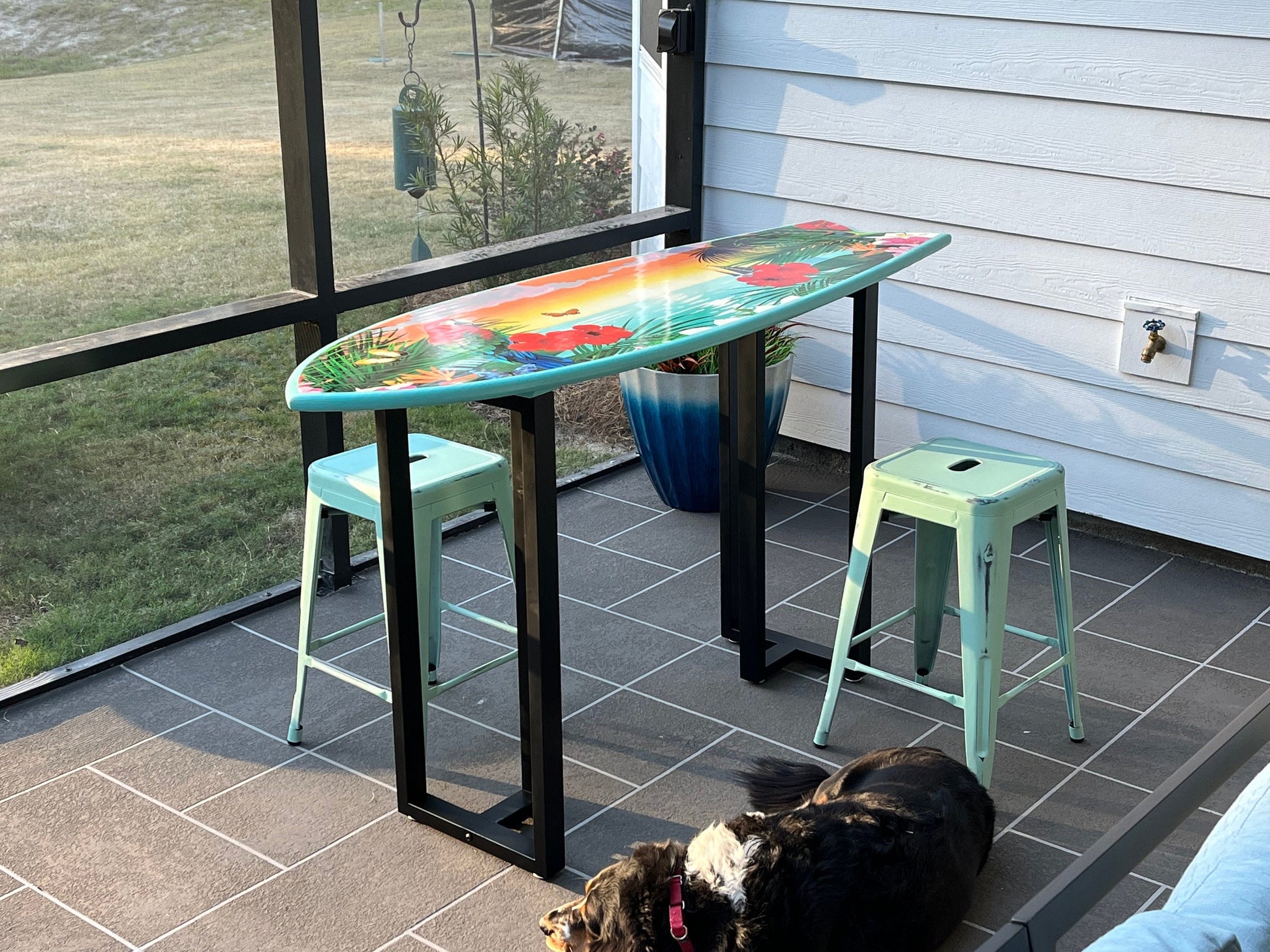 Surfboard Table Top, perfect for coastal beach decor, beach and tiki decor. LEGS NOT INCLUDED This is a digital print applied to a 5/4" wood board panel. We can also customized to a different design for a extra cost.